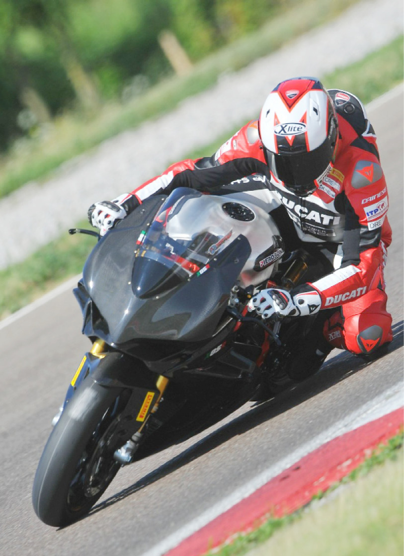 Nei cambi richiede un’azione decisa del pilota e bisogna portare dentro le spalle, però è molto stabile in traiettoria e precisa in frenata. Le quote della ciclistica sono abbastanza diverse da quelle della Panigale, che essendo più stradale richiede meno forza.